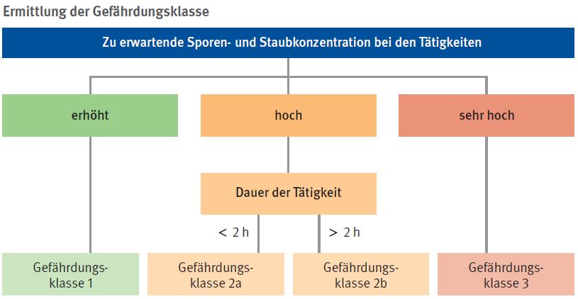 - Die Gefährdung ist abhängig von der Staub- und Sporenexposition, die bei den Tätigkeiten zu erwarten ist, sowie von der Dauer der Tätigkeit. Die Tätigkeitsdauer umfasst das Entfernen befallener Materialien und die anschließende Reinigung des Arbeitsbereiches. Über die Faktoren Exposition und Dauer der Tätigkeit kann eine Gefährdungsklasse abgeleitet werden, aus der sich die erforderlichen Schutzmaßnahmen ergeben.