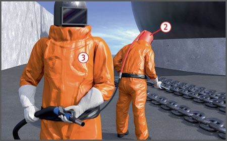 - Personen, die sich im Gefährdungsbereich während der Strahlarbeiten mit Gefahrstoffbelastung aufhalten, z. B. beim Entfernen von Strahlmittelrückständen, müssen ebenfalls Kombinationsschutzanzüge und Atemschutz tragen.