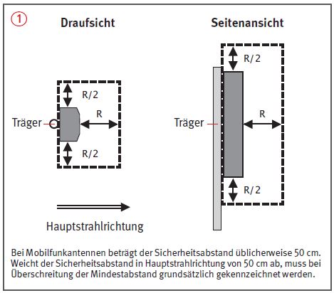 - Zu Mobilfunkantennen ohne besondere Warnzeichen den Abstand von 1 m in Hauptstrahlrichtung und von 0,5 m in alle anderen Abstrahlrichtungen der Antenne einhalten