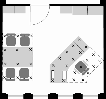 Abb. 4: Beispiel für die Verteilung der Messpunkte (x) für einen Bereich des Arbeitsplatzes