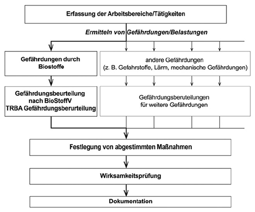 (2) Am Arbeitsplatz können neben Biostoffen gleichzeitig weitere unterschiedliche Belastungen oder Gefährdungen bestehen. Diese sind getrennt zu erfassen und zu beurteilen. Die Schutzmaßnahmen sind darauf abzustimmen und müssen alle Gefährdungen berücksichtigen (siehe Abbildung 1).
