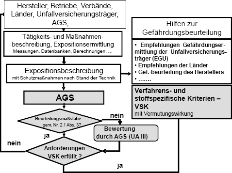 (1) Die Aufnahme von VSK in die TRGS 420 erfolgt auf Beschluss des AGS nach dem Schema von Bild 1. Voraussetzung ist das Vorliegen von Expositionsbeschreibungen gemäß den Anforderungen dieser TRGS einschließlich Festlegung der zu den VSK gehörenden Schutzmaßnahmen und ihrer Wirksamkeitsprüfung.