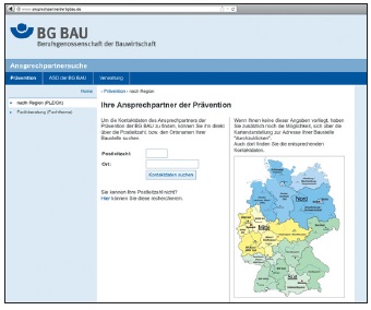 | Um die Kontaktdaten des Ansprechpartners der Prävention der BG BAU zu finden, können Sie ihn direkt über die Postleitzahl bzw. den Ortsnamen Ihrer Baustelle suchen. Wenn Ihnen keine dieser Angaben vorliegt, haben Sie zusätzlich noch die Möglichkeit, sich über die Kartendarstellung zur Adresse Ihrer Baustelle "durchzuklicken". Auch dort finden Sie die entsprechenden Kontaktdaten.