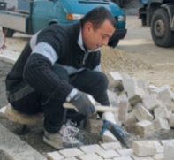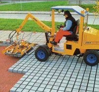 Das Verlegen von Verbundpflastersteinen kann mit hydraulischen Verlegezangen, die an entsprechende Trägergeräte angebaut werden, erfolgen.