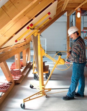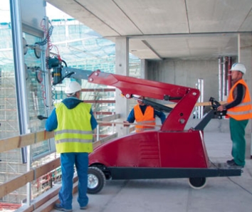 Zum Transport und Einbau flächiger Bauteile mit glatten Oberflächen (z. B. Glasscheiben, Fassadenplatten, Gipskartonplatten). Die Gegenstände werden mittels Saugtellern fixiert und können in den unterschiedlichsten Positionen und Neigungswinkeln gehalten und eingebaut werden. So entfällt das Heben und Tragen schwerer Lasten beim Transport, das Heben und Halten und die damit verbundene Überkopfarbeit beim Einbau der Elemente.