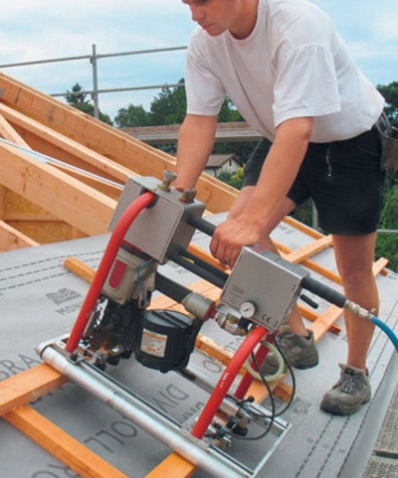Das Einlatten von Dachflächen beinhaltet auch das Messen und Ausrichten von Dachlatten. Das Fixieren und Befestigen erfolgt mit Hammer bzw. Druckluftnagler. Diese Tätigkeiten erfordern das Arbeiten in Zwangshaltungen und den Umgang mit Hammer oder Handmaschinen über einen langen Zeitraum. Mit dem Einlattgerät werden die Latten ausgerichtet, auf Länge geschnitten und genagelt. Damit verringert sich die körperliche Belastung deutlich.