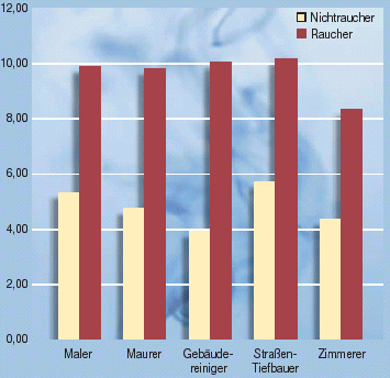 Bei Arbeitsmedizinischen Vorsorgeuntersuchungen von Beschäftigten der Bauwirtschaft wurden bei Rauchern Verengungen der Atemwege, wie chronische Bronchitis, doppelt so häufig gefunden wie bei Nichtrauchern.