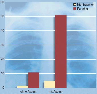 Das Risiko an Lungenkrebs zu erkranken, wird durch Arbeiten mit Asbest um das 5-fache erhöht. Wird zusätzlich geraucht, erhöht sich das Risiko um das 50-fache.