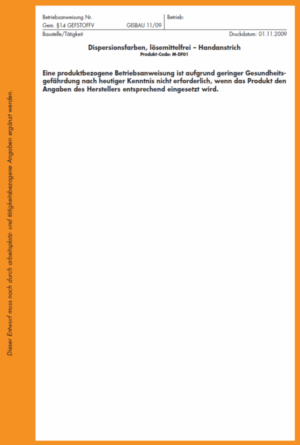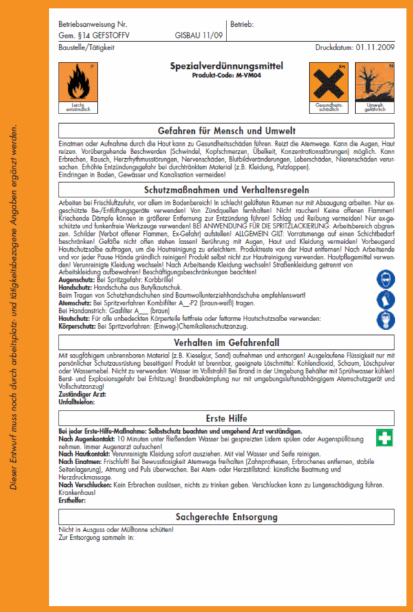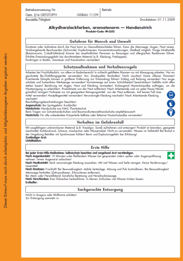 Merkblätter und Preislisten der verwendeten Produkte. Diese Produkt-/gruppen-Information unterstützt Sie bei der Durchführung der Gefährdungsbeurteilung nach § 6 der neuen Gefahrstoffverordnung und kann ggf. für Dokumentationszwecke verwendet werden. Betriebsspezifische oder tätigkeitsbezogene Abweichungen oder Ergänzungen sind dann im Kapitel "Gefährdungsbeurteilung" anzugeben. |