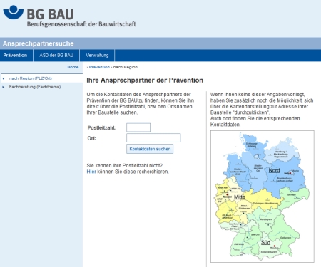 | Um die Kontaktdaten des Ansprechpartners der Prävention der BG BAU zu finden, können Sie ihn direkt über die Postleitzahl bzw. den Ortsnamen Ihrer Baustelle suchen. Wenn Ihnen keine dieser Angaben vorliegt, haben Sie zusätzlich noch die Möglichkeit, sich über die Kartendarstellung zur Adresse Ihrer Baustelle "durchzuklicken". Auch dort finden Sie die entsprechenden Kontaktdaten.