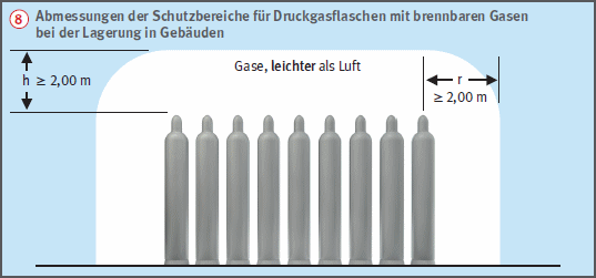 - Druckgasflaschen mit brennbaren Gasen müssen von einem Schutzbereich umgeben sein