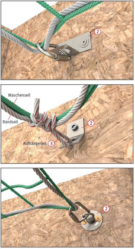 - nur geprüfte, dauerhaft gekennzeichnete und unbeschädigte Schutznetze analog System S (Netz mit Randseil) verwenden,