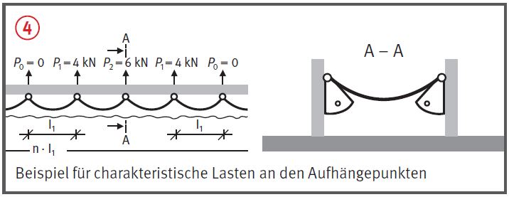 (Seil-Bruchkraft ≥ 30 kN) oder zweisträngigem Aufhängeseil (Seil-Bruchkraft ≥ 15 kN). Für andere Verbindungsmittel als Aufhängeseile (z. B. Schäkel oder Karabiner) muss die charakteristische Last P mit dem Sicherheitsfaktor 2 multipliziert werden,