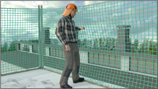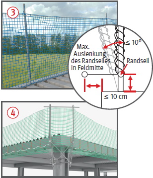 - Montage gemäß Aufbau- und Verwendungsanleitung des Herstellers. Besonderheiten an Gebäudeecken oder beim Endfeld des Randsicherungssystems sind zu beachten