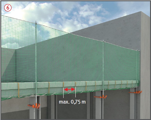 - Schutznetz im unteren Bereich mindestens alle 75 cm an Bauteilen (z.B. gespanntes Seil) befestigen