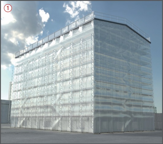 - Öffnungen im Wetterschutzdach und im bekleideten Stützgerüst (z. B. Kassetten, Planen) sind nach Arbeitsende und bei längeren Arbeitsunterbrechungen zum Schutz vor Witterungseinflüssen (z. B. starker Wind) zu schließen.