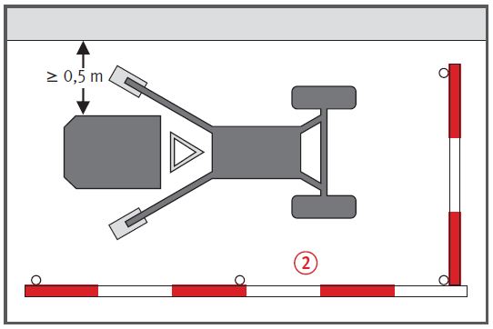 Den beim Betrieb des Anstellaufzuges geforderten Abstand von min. 40 cm zwischen dem Lastaufnahmemittel und Arbeits- und Verkehrsbereichen bereits bei der Festlegung des Standortes berücksichtigen. Zu festen Objekten in der Umgebung der Ladestelle ist ein Abstand von min. 50 cm einzuhalten. Ist aus arbeitstechnischen Gründen der Sicherheitsabstand nicht einzuhalten: Fahrbahn dicht verkleiden.
