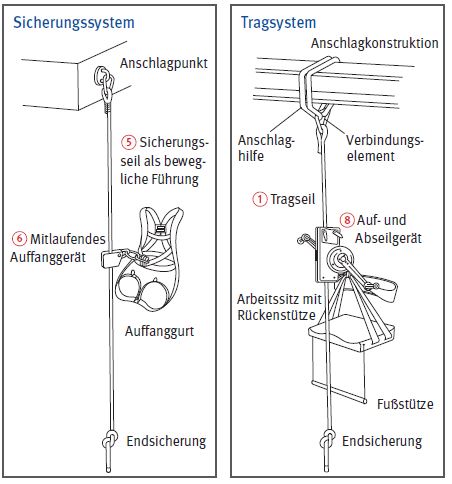Auffanggurt zu verwenden. Beide Bauarten bestehen aus einem Trag- und Sicherungssystem.
