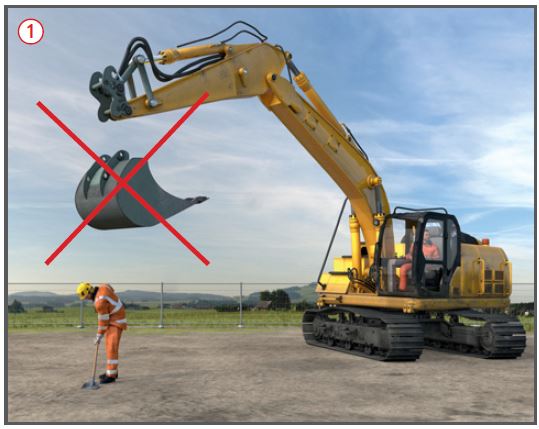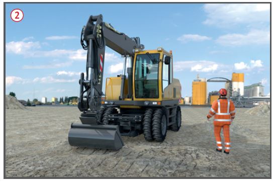 Beim Arbeiten in der Nähe von Erdbaumaschinen und Teleskopstaplern Warnkleidung tragen.