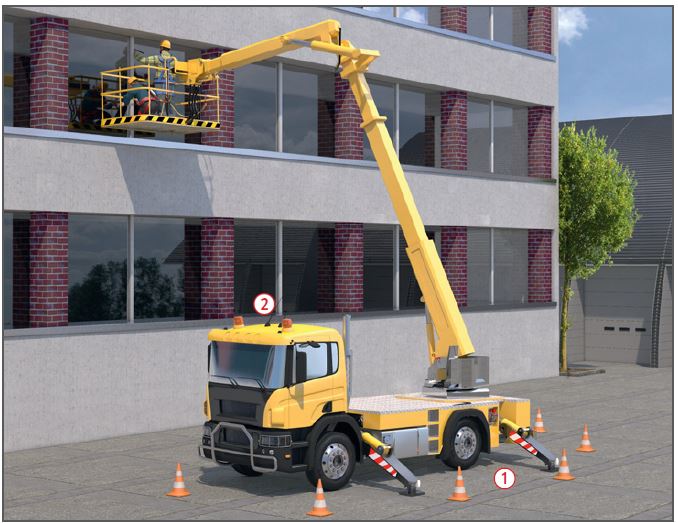 Den Bereich unter seitlich ausgeschwenkten Arbeitsplattformen von Hubarbeitsbühnen sichern, wenn sie im Verkehrsbereich von Straßenfahrzeugen niedriger als 4,50 m über Gelände abgesenkt sind.