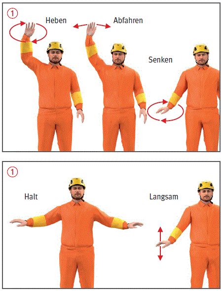 - Verständigung zwischen Einweiser und Kranführer durch direkten Sichtkontakt mit festgelegten Handzeichen
