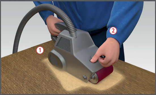 Darauf achten, dass Schleifbandlaufrichtung und Maschinenlauf übereinstimmen. Pfeile auf Schleifbandinnenseite mit denen der Maschinen vergleichen. Schleifband mittig justieren.