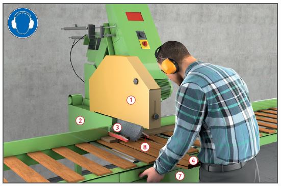 Gehörschutz und Sicherheitsschuhe benutzen. Lärmbereiche kennzeichnen.