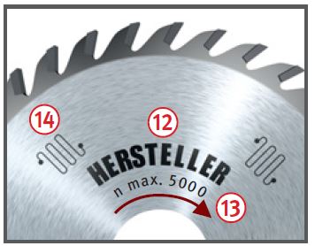 Bei Verbundkreissägeblättern muss zusätzlich die höchstzulässige Drehzahl angegeben sein. Angegebene Drehzahl nicht überschreiten .