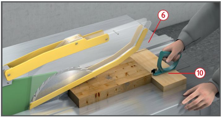 Bei schmalen Werkstücken Schiebestock oder Schiebeholz mit Wechselgriff benutzen, wenn
