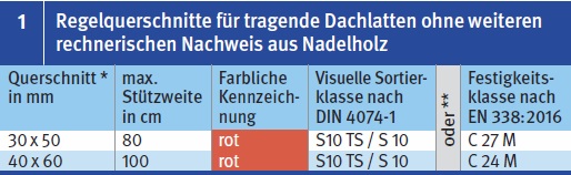 - Dachlatten können ohne rechnerischen Nachweis in Abhängigkeit von der Stützweite nach Tab. 1 eingebaut werden, ansonsten müssen Dachlatten für den Querschnitt und das Verbindungsmittel rechnerisch nachgewiesen werden.