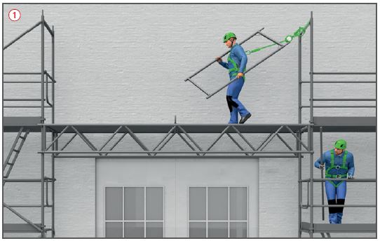 PSAgA nur an geeigneten und nachgewiesenen Gerüstbauteilen befestigen (siehe Aufbau- und Verwendungsanleitung des Gerüstherstellers), z. B. bei Stahlrohrgerüsten am Außen- bzw. Innenstiel oder am Geländerholm.