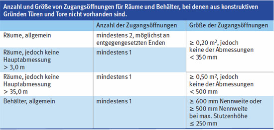 Darauf achten, dass genügend große Zugangs- oder Einstiegsöffnungen vorhanden sind, um im Gefahrfall den Raum jederzeit schnell verlassen und Verunglückte retten zu können (s. Tabelle).