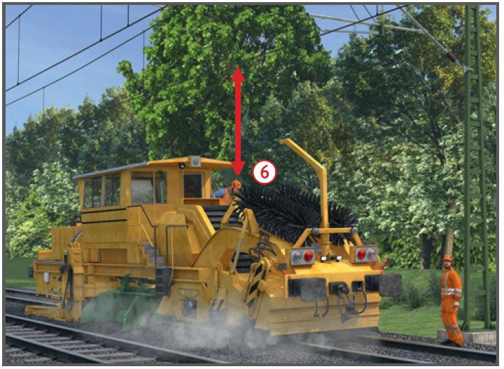 - Ausschwenkbegrenzungen für die Planierschilde so einstellen, dass der Bahnbetrieb im Nachbargleis nicht gefährdet wird (Gleisabstand, Bogenradius, Überhöhung, Lichtraumprofil beachten).