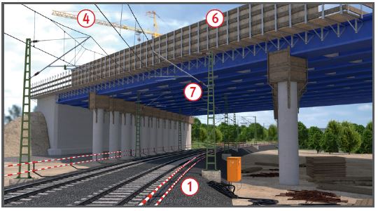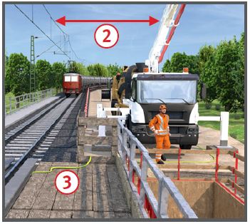- Wenn Lasten (z. B. Rüstträger, Fertigteile) über der Bahntrasse versetzt werden müssen, muss diese gesperrt sein und die Fahrleitungsanlage muss ausgeschaltet sein.