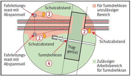 - Gefahr durch unbeabsichtigte Annäherung an die Fahrleitungsanlage durch Großgeräte, wie Turmdrehkran, Betonpumpe, prüfen und in Abstimmung mit dem Bahnbetreiber Schutzmaßnahmen festlegen. Wenn Gefahr besteht, dass der Schutzabstand unterschritten wird: Fahrleitungsanlage ausschalten lassen.