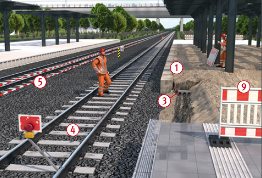 Am Bahnsteigrand nur mit Sicherung (z. B. Gleissperrung ) arbeiten und Gefahrenbereich freihalten.
