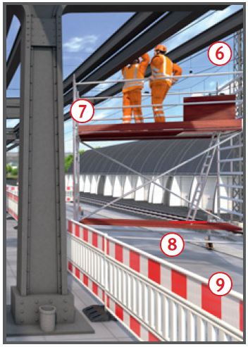 Gerüste und Dachrandsicherungen in der Nähe der Fahrleitung müssen, nach Anweisung des Bahnbetreibers, mit der Bahnerde verbunden sein.