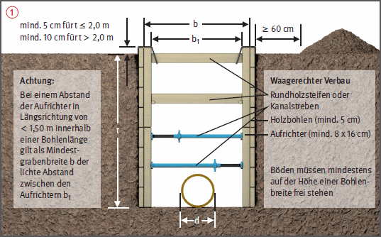 Leitungsgräben normgerecht nach DIN 4124 verbauen. Wird von den Maßen der Regelausführung abgewichen, ist der Verbau statisch nachzuweisen.