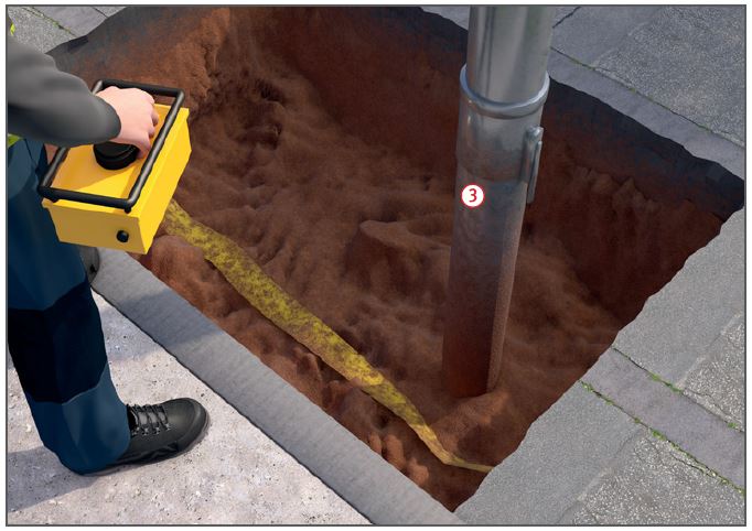 - Freilegen der erdverlegten Leitung in Handschachtung oder mit z. B. Saugbaggern