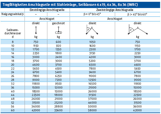 | Tragfähigkeiten Anschlagseile mit Fasereinlagen, Seilklassen 6x19 und 6x36 |