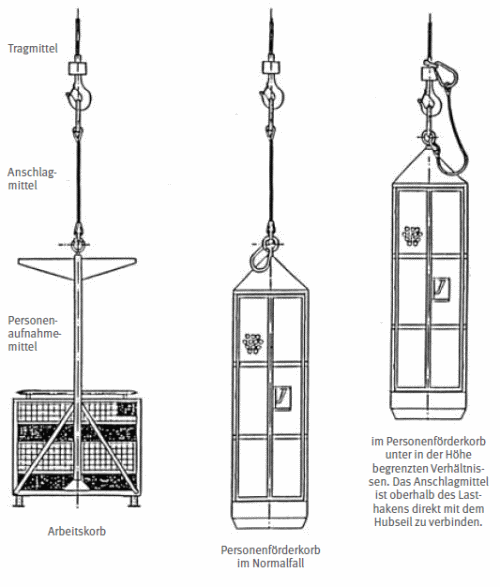 5.1.5.8 Anschlagmittel von Personenaufnahmemitteln dürfen nicht wechselweise auch zum Anschlagen von Lasten benutzt werden. Personenförderkörbe und Arbeitskörbe ohne fest angebaute Winde oder Winde in der Aufhängung sind mit dem nach Abschnitt 4.1.3.1 geforderten Anschlagmittel mit dem Tragmittel des Hebezeuges zu verbinden.