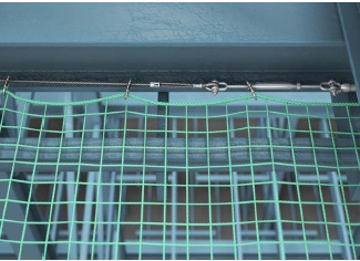 Einem Netz analog der Netzklasse B1 nach DIN EN 1263-1, jedoch einer Maschenweite von nicht größer als 45 mm, einer verstärkten Randeinfassung, einem Stahlseil mit einem Mindestdurchmesser von 6 mm, Verbindungsmitteln zwischen verstärkter Randeinfassung und Stahlseil (z. B. Karabinerhaken oder Schäkel) mit einer hinreichenden Zugfestigkeit und einem Seilspanner mit einer Zugkraft entsprechend dem Seildurchmesser.