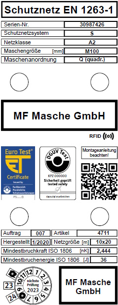 | DIN EN 1263-1: | Schutznetz (Sicherheitsnetz) entspricht der Norm |