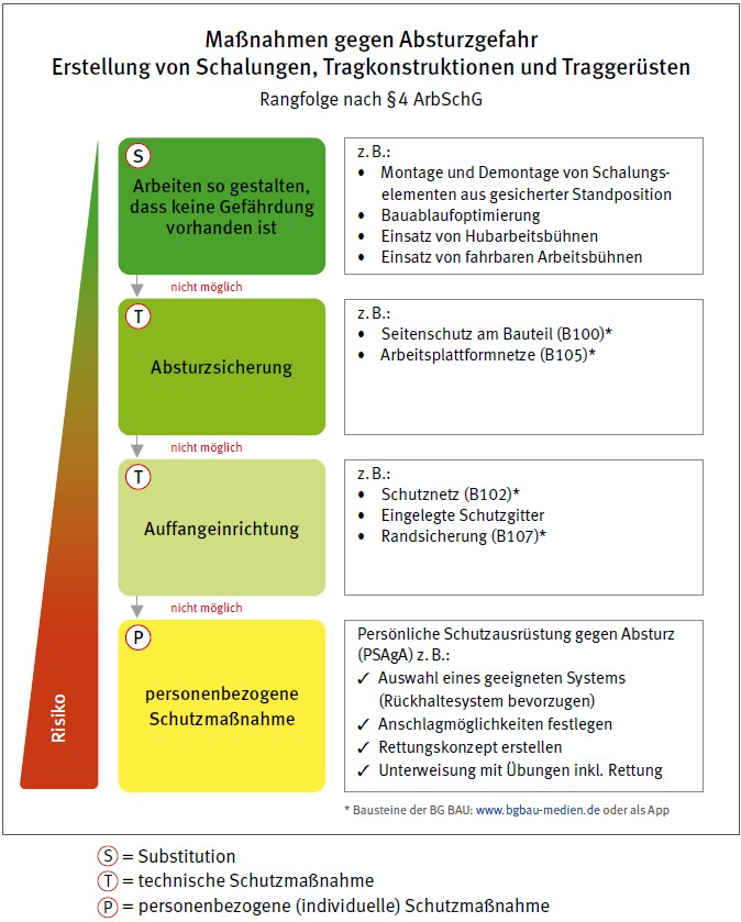 Bei der Verwendung von Schalungen, Tragkonstruktionen und Traggerüsten sind, in Abhängigkeit vom Objekt oder der Konstruktion, geeignete Maßnahmen zum Schutz gegen Absturz entsprechend der Rangfolge gemäß § 4 Absatz 2 Satz 2 BetrSichV (Absturzsicherung, Auffangeinrichtung, persönliche Schutzausrüstung gegen Absturz) vor Beginn der Arbeiten zu planen, auszuwählen und festzulegen.