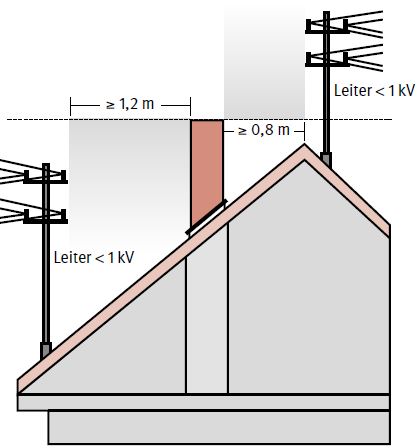 An Abgasanlagen, an denen Schornsteinfegerarbeiten ausgeführt werden, müssen nicht isolierte elektrische Freileitungen für Nennspannungen unter 1000 V (1 kV)