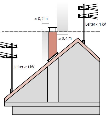 Sind an der Mündung der Abgasanlage Einrichtungen vorhanden, z. B. geschlossene Schornsteinaufsätze, die eine Berührung eines über die Mündung hinaus geführten Werkzeuges mit unter Spannung stehenden Teilen ausschließen, oder sind die Freileitungen isoliert, dürfen abweichend elektrische Freileitungen für Nennspannungen unter 1kV bis auf einen waagerechten Mindestabstand zur Außenwand der Abgasanlage