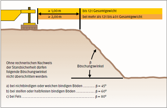 ![]() Abb. 108 Sicherheitsabstände zu Baugruben und Gräben Stellen Sie sicher, dass Betonpumpen mit Verteilermast standsicher aufgestellt sind. Verwenden Sie lastverteilende Unterlagen und halten Sie den Sicherheitsabstand zu Böschungskanten ein. Beachten Sie, dass beim Umsetzen nicht mit ausgefahrenem Mast gefahren wird. Verteilermaste dürfen nicht über die in der Betriebsanleitung angegebene Maximallänge hinaus verlängert werden. Schutz vor Stromschlag Klären Sie mit Ihrem Auftraggeber, Ihrer Auftraggeberin bzw. dem Versorgungsunternehmen ab, welche Maßnahmen bei Unterschreitung der vorgeschriebenen Sicherheitsabstände zu elektrischen Freileitungen zu ergreifen sind, z. B. beim Einsatz von Betonpumpen. Schutz vor Hitzeerschöpfung und Strahlung Organisieren Sie die Arbeitsabläufe so, dass die körperliche Belastung durch Hitze so gering wie möglich gehalten wird. Die regelmäßige Flüssigkeitsaufnahme, die Verlagerung körperlich schwerer Arbeiten in kühlere Tageszeiten und der Aufenthalt während Pausen im Schatten sind sinnvoll. Informieren Sie sich und Ihre Beschäftigten über die besonderen Maßnahmen der Ersten Hilfen bei Hitzeerschöpfung bzw. Hitzschlag. Sorgen Sie bei Schweißarbeiten für die Bereitstellung der erforderlichen persönlichen Schutzausrüstungen, um sich vor der Strahlung zu schützen.