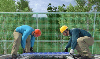 Kontrollieren Sie die Gerüste vor deren Nutzung auf Betriebssicherheit (z. B. dreiteiliger Seitenschutz, Ausführung der Schutzwand insbesondere im Bereich der Durchführung von Schrägaufzügen). ![]() Abb. 136 Solarelementmontage Beachten Sie, dass bei der Verwendung von PSAgA weitere Maßnahmen (z. B. gesonderte Gefährdungsbeurteilung, spezielle Unterweisung, Rettungskonzept) notwendig sind. Legen Sie vor Beginn der Arbeiten die geeigneten Anschlageinrichtungen für die PSAgA fest. Durchsturzsicherung Sorgen Sie dafür, dass die Gefahr des Durchstürzens verhindert wird. z. B. durch: