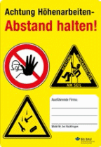Schutz vor herabfallenden Gegenständen Sorgen Sie dafür, dass Baumaterial, Kleinteile und Werkzeuge in geeigneten Behältern sicher aufbewahrt werden. Berücksichtigen Sie dabei die Windverhältnisse in großen Höhen. Ermitteln Sie zuerst den Gefahrbereich am Fuß des Bauwerkes entsprechend der Tabelle. Sperren Sie diesen Bereich ab (feste Absperrungen – kein Flatterband!) und kennzeichnen Sie diesen mit dem Verbotszeichen "Zutritt für Unbefugte verboten" (D-P006). Radius des Gefahrbereichs um das Bauwerk mit hochgelegenen Arbeitsplätzen nach DGUV Information 201-055