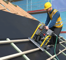 ![]() Abb. 6 Arbeiten auf dem Dach mit einer Dachauflegeleiter und PSA gegen Absturz |